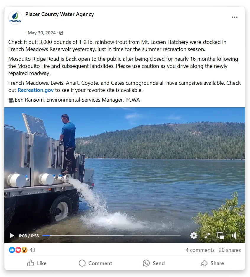 At Duncan Creek, PCWA's modification of the Duncan Diversion Dam will help restore natural sediment transport processes to support stream health. New features will allow sediment to naturally move downstream past the dam, enhancing fish spawning and rearing habitat and the riparian corridor. A state-of-the-art fish screen will ensure that trout remain in Duncan Creek and a downstream bypass channel will facilitate downstream migration to key habitats during critical life stages. Tailored seasonal flow adjustments that mimic the natural snowmelt hydrograph will enhance aquatic and riparian resources. These efforts ensure the watershed here remains a more natural part of the ecosystem. By balancing operational needs with ecological care, PCWA demonstrates leadership in sustainable stewardship, helping safeguard water and wildlife resources.
